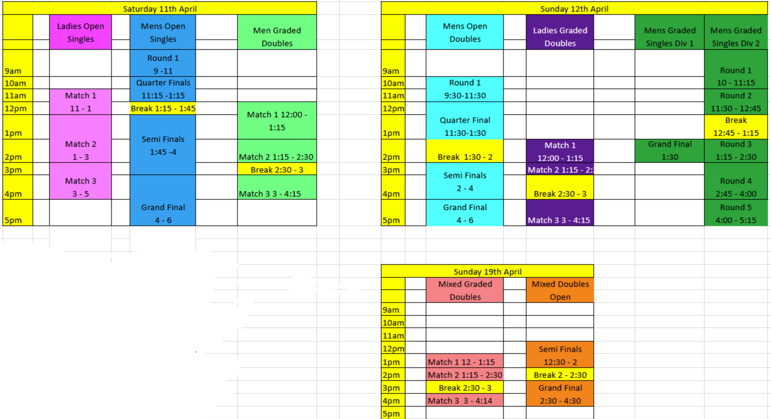 Each event will be held on a single day except the Grand Final. If you enter an individual event and make it to the Grand Final you must be available to play the Grand Final anytime on Sunday 19th April.